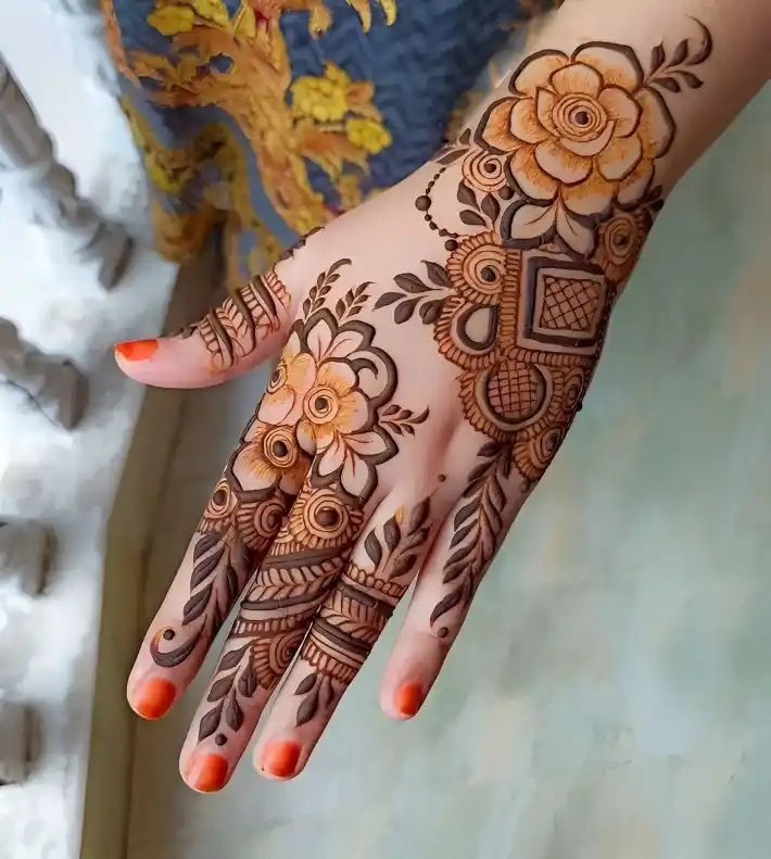 इस डिजाइन में बड़े-बड़े रोज़ फ्लॉवर और शेडिंग का इस्तेमाल होता है। हाथों को फुलर लुक देता है। दुल्हनें भी इसे पसंद करती हैं। फोटोशूट के लिए बहुत खूबसूरत दिखता है।