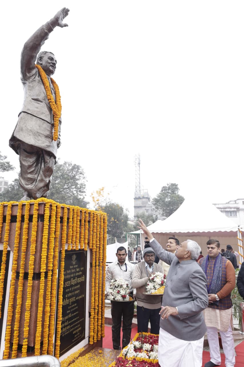 Atal Bihari Vajpayee: पूर्व प्रधानमंत्री भारत रत्न स्व० अटल बिहारी वाजपेयी जी की 101 वीं जयंती आज पूरे देश में मनायी गयी। स्व० अटल बिहारी वाजपेयी जी के जन्मदिवस पर राजकीय जयंती समारोह का आयोजन पाटलिपुत्रा पार्क, पटना में किया गया। मुख्यमंत्री नीतीश कुमार ने स्व० अटल बिहारी वाजपेयी की प्रतिमा पर माल्यार्पण कर उन्हें भावभीनी श्रद्धांजलि अर्पित की।
