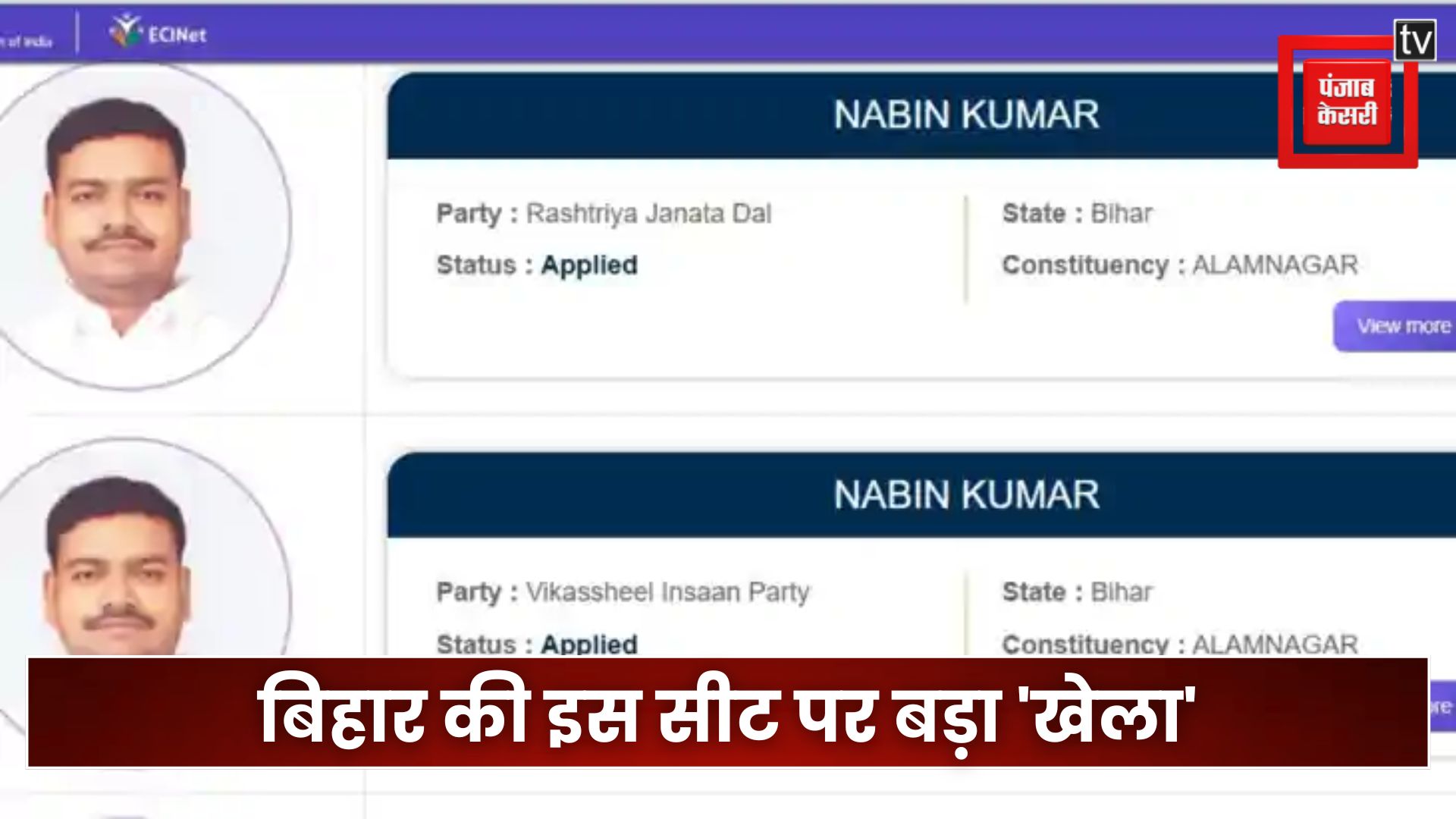 पूरा मामला आलमनगर विधानसभा सीट (Alamnagar Assembly Seat) का है। जानकारी के अनुसार, आलमनगर विधानसभा सीट से नवीन कुमार नाम के प्रत्याशी ने VIP (विकासशील इंसान पार्टी) और RJD (राष्ट्रीय जनता दल)—दोनों ही दलों के टिकट पर नामांकन दाखिल किया है। सूत्रों के मुताबिक, चुनाव आयोग की आधिकारिक वेबसाइट पर अपलोडेड दस्तावेजों में यह गड़बड़ी साफ तौर पर देखी जा सकती है, जिसमें नवीन कुमार का नाम दोनों दलों के अधिकृत प्रत्याशी के रूप में दर्ज है।