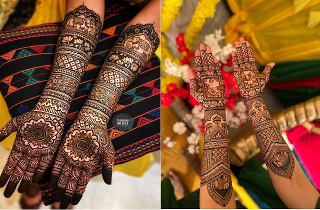 इस डिजाइन में शादी से जुड़ी चीजें जैसे — हाथी, मंडप, कलश आदि की खूबसूरत झलक देखने को मिलती है। इसमें हथेली पर कलश बनवाना बेहद शुभ माना जाता है। साथ ही यह डिज़ाइन आसानी से हाथों पर जम जाती है और बहुत ग्रेसफुल लगती है।