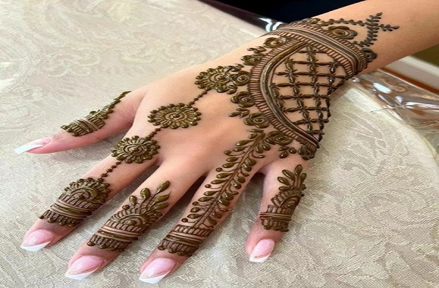 जैसे हाथ में ब्रेसलेट या रिंग्स हों, वैसा लुक देने वाला यह डिजाइन पार्टी और फेस्टिव दोनों के लिए बेस्ट है। इसमें हाथों के पीछे की तरफ सुंदर पैटर्न बनाए जाते हैं।