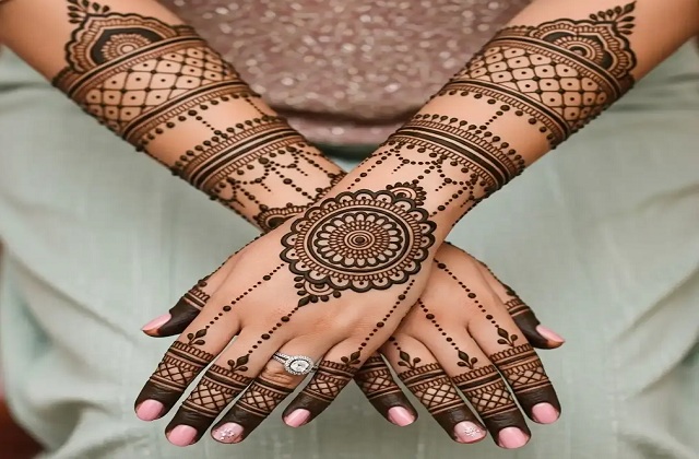 आजकल गोल और नेट पैटर्न वाली मेहंदी काफी ट्रेंड में है। यह देखने में यूनिक लगती है और बहुत कम वक्त में बन जाती है। आप इसे हल्के ग्लिटर या स्टोन के साथ और भी स्टाइलिश बना सकती हैं।