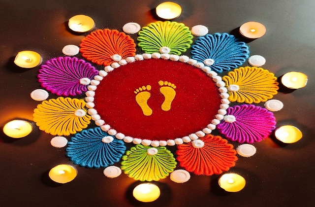 - बीच में स्वास्तिक और चरण बनाकर रंगोली को पूरा करें।