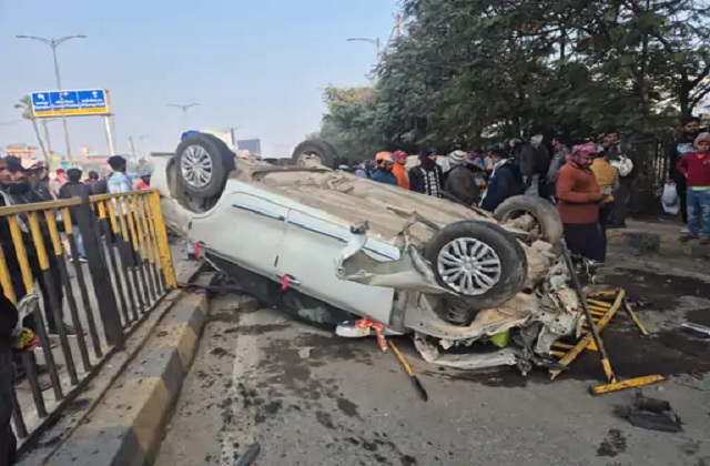 रेलिंग तोड़ते हुए बीच सड़क पर पलटी कार