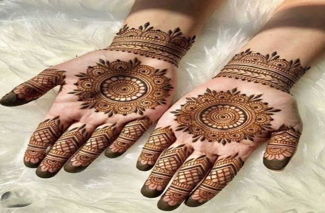 अगर आप परंपरा से जुड़ा लुक चाहती हैं तो यह डिजाइन आपके लिए परफेक्ट है। हथेली के बीच में छोटा गोला बनाकर धीरे-धीरे उसे बढ़ाते हुए circular mandala structure तैयार करें। चाहें तो कलाई तक डिजाइन बढ़ाकर इसे और आकर्षक बना सकती हैं।