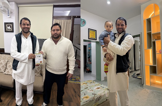 मंगलवार को सामने आई तस्वीरों में तेजप्रताप यादव अपने पिता लालू यादव और मां राबड़ी देवी से आशीर्वाद लेते नजर आए। सबसे भावुक पल तब दिखा जब उन्होंने अपने छोटे भाई और बिहार विधानसभा में नेता प्रतिपक्ष तेजस्वी यादव से गर्मजोशी से मुलाकात की। इतना ही नहीं, तेजप्रताप ने तेजस्वी की बेटी कात्यायनी को गोद में लेकर दुलार किया, जिसकी तस्वीरें सोशल मीडिया पर तेजी से वायरल हो रही हैं।