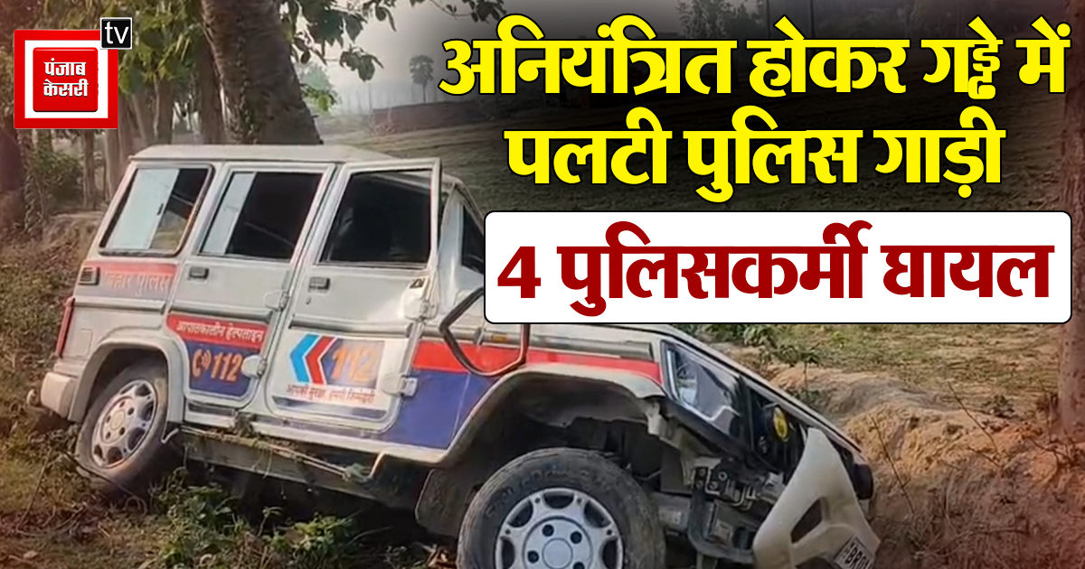 अनियंत्रित होकर गड्ढे में पलटी पुलिस गाड़ी, नीलगाय से बचने के दौरान हुआ हादसा; 4 पुलिसकर्मी घायल