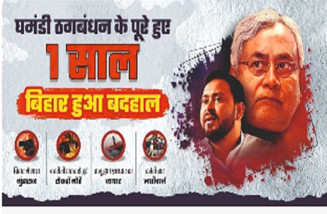 सम्राट चौधरी ने कहा कि बालू माफियाओं के आतंक से जनता और अधिकारी थर्रा उठी। बिहार पुलिस के मुताबिक राजधानी में लगभग हर दिन एक मर्डर होना आम हो गया। हिंदू समाज की आस्थाओं पर सरकार के बड़े नेताओं के अपमानजनक प्रहार होने लगे। शोभायात्राओं पर पथराव की घटनायें आम हो गयीं. राजनीतिक हत्याओं का दौर फिर से शुरू हो गया. यहां तक कि बेगुसराय और हाजीपुर जैसे शहरों में खुलेआम बीच सड़क पर गोलियां दागी गयी. लेकिन नीतीश जी के जमीर की नींद आज तक नहीं टूटी है। उन्होंने कहा कि दरअसल नीतीश कुमार अपने ईमान और अपनी अंतरात्मा दोनों का गला घोंट चुके हैं, न तो राजद के युवराजों की पालकी ढ़ोने में शर्म आती है और न ही उनमें सोनिया गांधी के सामने झुक कर जेपी के संघर्षों का मजाक उड़ाने में ग्लानी का भाव उत्पन्न होता है। बहरहाल नीतीश कुमार यह जान और मान लें कि सिर्फ ठगबंधन सरकार का एक वर्ष नहीं बीता है बल्कि हमेशा बैसाखी पर चलने वाली उनकी राजनीति का भी एक साल कम हो गया है। कुछ दिन और हैं उन्हें जितनी लाठियां और गोलियां चलवानी हों, चला लें। उनका घड़ा भर चुका है। आने वाले समय में बिहार की जनता और उनके अशुभचिंतक साथी उनका जो हाल करेंगे वह हर किसी के लिए एक उदाहरण होगा।
