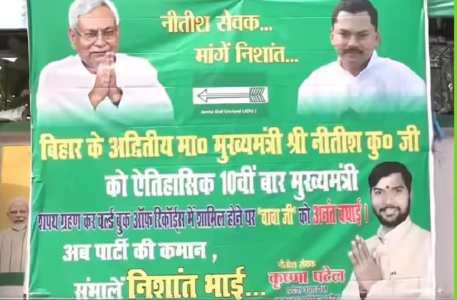 मुख्यमंत्री नीतीश कुमार और उनके बेटे निशांत के पोस्टर कई सड़कों और JD(U) कार्यालय के बाहर लगे दिखे हैं। पोस्टरों पर लिखा है, “नीतीश का सेवक… निशांत की मांग… अब पार्टी की कमान संभालें निशांत भाई। (नीतीश के समर्थक निशांत की मांग करते हैं… अब निशांत भाई को पार्टी की कमान संभालनी चाहिए)।" ये पोस्टर, नीतीश कुमार को ऐतिहासिक 10वीं बार मुख्यमंत्री के रूप में शपथ लेने पर बधाई देते हुए, दावा करते हैं कि निशांत JD(U) के भविष्य के नेता हैं। उनके अचानक सामने आने से पार्टी कार्यकर्ताओं और जनता के बीच इस बात पर चर्चा शुरू हो गई है कि क्या निशांत कुमार सक्रिय राजनीति में कदम रखने की तैयारी कर रहे हैं।