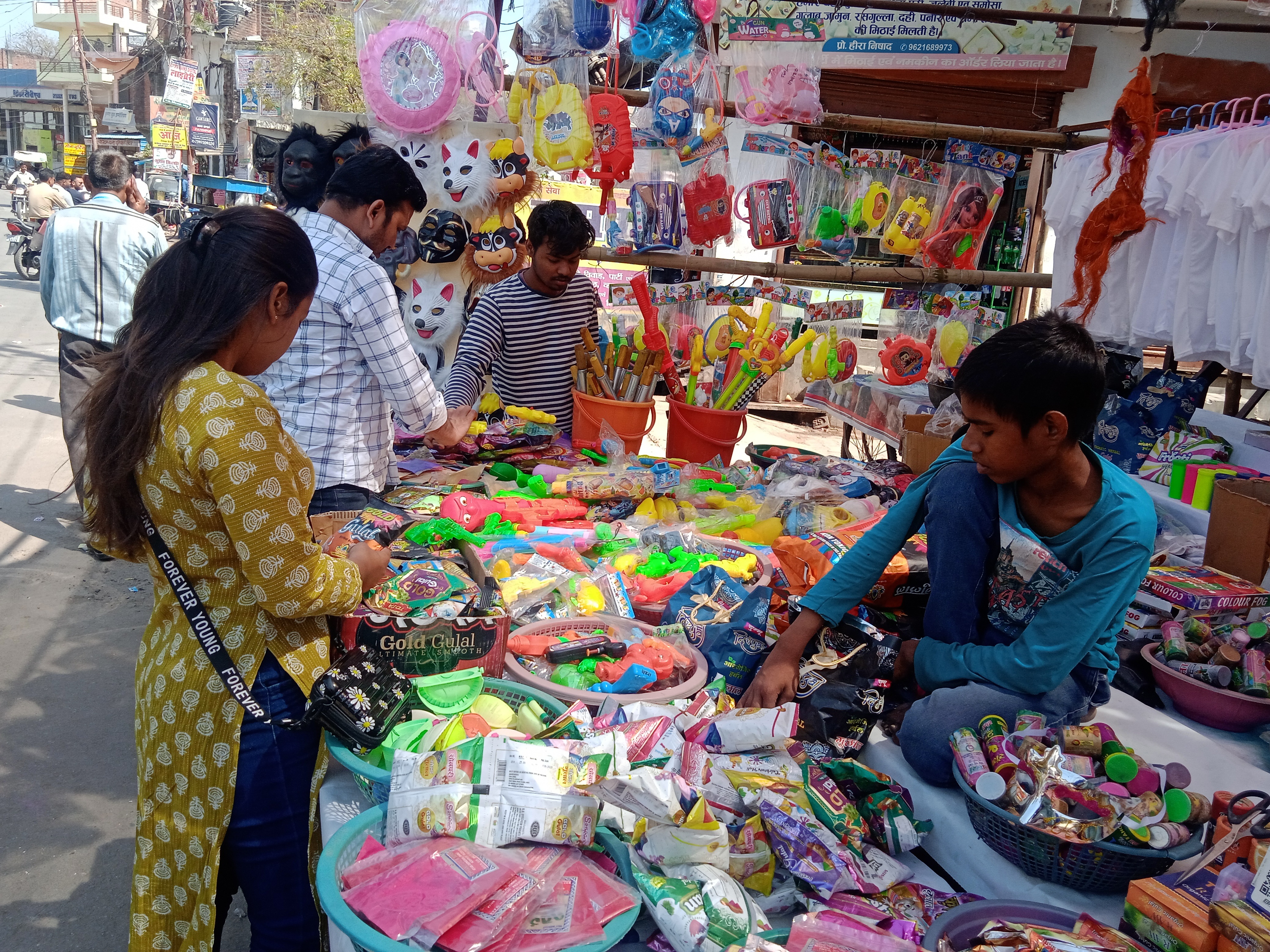 पिचकारी, कपड़े, किराना सामान, मेवा की खरीददारी तेज है। होलिका दहन की पूजा के लिए भी पूजन सामग्री की भी खरीदारी लोग कर रहे हैं। होली के दौरान उपयोग की जाने वाली अन्य सामग्री से भी बाजार भरे-पड़े हैं। बच्चों के लिए तरह-तरह के मैजिक गुलाल गन एवं इंडियन पिचकारियां बाजार में उपलब्ध हैं। बाजार में बच्चों के लिए कार्टून कैरेक्टर वाले रंग-बिरंगे मास्क उपलब्ध हैं। इसमें छोटा भीम, एवेंजर, स्पाइडर मैन, हल्क और घोस्ट, बार्बी डॉल्स, मोनो फिश, आयरन मैन, बैटमैन, रोबोट, कैप्टन अमेरिका वाले मास्क मुख्य हैं।