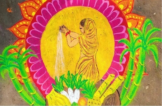 छठ पूजा के मौके पर सूर्यदेव वाली रंगोली जरूर बनाई जाती है। यहां देखें कैसे व्रती महिला को रंगोली में सूर्यदेव को अर्घ्य देता हुआ दिखाया गया है। इस तरह की रंगोली शुभ मानी जाती है।