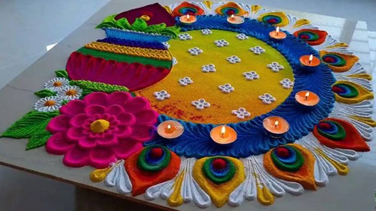 अगर आपको भरी-भरी रंगोली पसंद है तो आप इस तरह की रंगोली बनाएं। ये डिजाइन गली-मोहल्ले में बनाई जाए तो लोग तारीफ करते नहीं थकते हैं।